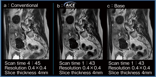 演者らは,女性骨盤領域においてT2強調画像にAiCE適用のCompressed SPEEDER(CS)を用いることで,従来法のパラレルイメージングよりも検査時間を短縮し,画質を改善することを報告している1)。図1は1.5Tで撮像した子宮筋腫症例のT2強調画像であるが,AiCEを適用したCS(b)では従来法(a)と比較して撮像時間が短縮し,ノイズが除去され,子宮筋腫がより明瞭に描出されている。卵巣奇形腫症例でも同様の画像が得られており,CSとAiCEの組み合わせは,画質を担保しつつ検査時間を短縮し,患者負担の軽減や検査の効率化に寄与している。