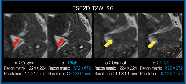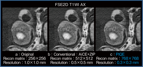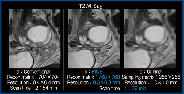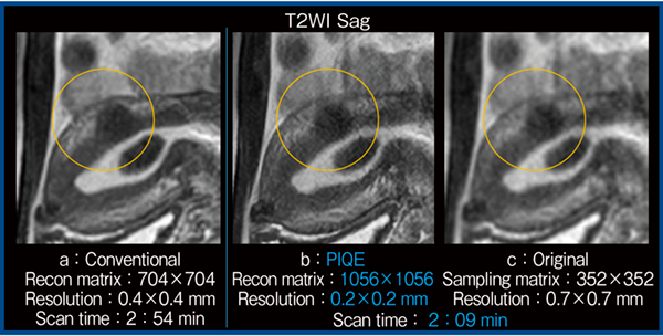 PIQEを用いることで,高SNR・高分解能画像の再構成が可能となり,正常構造や病変部の描出能が向上するほか,収集マトリックスを落とすことで撮像時間の短縮に寄与しつつ,従来条件と遜色のない画像の取得が可能となる。また,女性骨盤領域にPIQEを適用することで,高精細化による診断能向上や撮像時間短縮によるアーチファクトの低減,ワークフロー改善など検査の安定性向上が期待できる。