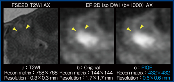 子宮筋腫症例にPIQEを適用したところ,SNRならびに面内分解能が向上して子宮や卵巣などの正常解剖が明瞭となり,子宮筋腫がより鮮明に描出された。左卵巣奇形腫症例(図2)でも,PIQE(c)によって腫瘤内部の構造がより明瞭に描出されており,PIQEはより細かな構造物の評価に有用な可能性が示唆される。図3は子宮体がんⅠA期の症例で,拡散強調画像(DWI)にて腫瘍と子宮筋層との良好なコントラストが得られるが(▶),PIQEを適用することで境界がより明瞭となる(c)。今後症例を蓄積し,病理所見との対比を通じてPIQEの有用性を示せる可能性がある。