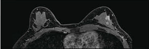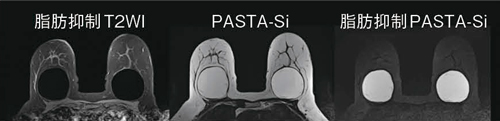 乳房のインプラントの検査用として,撮像シーケンス“PASTA-Si”があります。PASTA-Siは,シリコンと脂肪を選択して励起するシーケンスであり,インプラントの内容成分がシリコンか生理食塩水かの識別,およびシリコンの漏れの有無を確認することができます(図2)。
