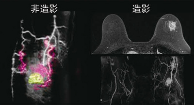 血液を内因性造影剤として血管を描出する非造影技術“Time-SLIP法”により,ブレスト領域では乳がんの栄養血管の描出,腫瘍へのラベル血の取り込みを確認することが可能です。Dynamic撮像で問題となる,生理周期による正常乳腺の非特異的染まりの一助となる可能性を期待して,現在研究を行っています(図3)。