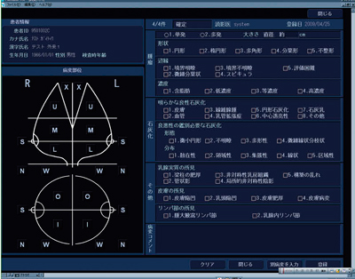 マンモグラフィ専用ビューア「RapidyeyeStation」は,マウス・キーボードでのシンプルなオペレーションを提供します。ハンギングプロトコルに対応し,画像の入れ替え,同一部位の背中合わせ表示などを読影者ごとに設定可能で,よりストレスの少ない,スピーディな読影を支援します。また,マンモレポートは,チェックボックス方式で簡単に入力が行え,一次読影,二次読影にも対応しており,検診用・精査用のどちらにでもご使用いただけます。確定レポートはWeb配信が行え,施設内でのレポートの共有が可能です。