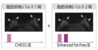 より確実で高い脂肪抑制効果を得るため,独自の脂肪抑制法“Enhanced Fat Free”法を搭載しました。本手法は2発の脂肪抑制パルスを組み合わせることで,RF強度のムラを低減し,消え残った脂肪を確実に抑制することができます(図2)。通常では,2発の脂肪抑制パルスを印加すると撮像時間の延長が気になりますが,本手法は縦磁化の回復を待たないため,SPAIR法のような撮像時間の延長がないことが特長です。