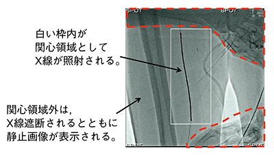 X線絞りを活用し,患者の被ばく箇所を減少させることはこれまで多用されてきた。X線絞りが挿入された箇所は,X線が遮断されるため黒く表示され,全体の位置が把握しにくいという指摘があった。また,X線検出領域にまでX線絞りが入ると,システムは線量不足と感知し,X線条件を上げてしまうことがある。これらを解決するために,“DoseRite SpotFluoro”では,設定された関心領域のみにX線が照射され,それ以外の領域には静止画が表示される。その際,関心領域の大きさにかかわらず,X線照射エリア内で最適なX線条件を算出し,X線絞りを用いた時のような線量上昇は起こさない。X線は関心領域内にのみ照射されるため,術者の手指の直接被ばくを低減することができる。