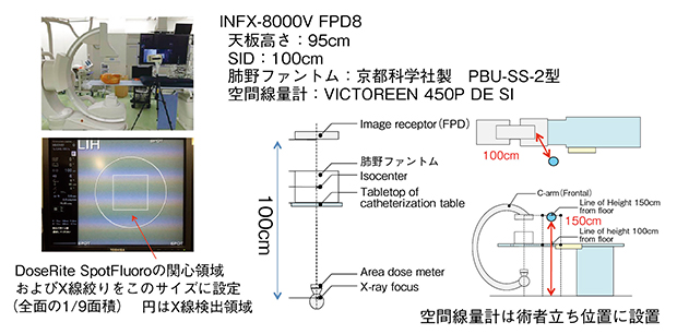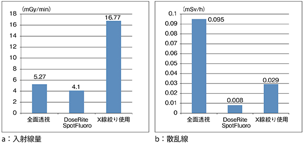 図3に,DoseRite SpotFluoroの表示と術者被ばく低減の様子を示す。肺野ファントムに対し,全面に照射した場合と,DoseRite SpotFluoroの関心領域とX線絞りを同じ大きさに設定した場合の入射線量率と散乱線線量率を測定した。測定条件を図4に,測定の結果を図5に示す。入射線量率では,全面透視とDoseRite SpotFluoroでは大きく変わらず,X線絞りを用いた場合では高くなった。その結果,散乱線の線量率もDoseRite SpotFluoroに比べX線絞りを用いる場合が高くなった。しかし,いずれも全面透視に比べ低くなっているので,術者の被ばく防止の観点ではX線絞りを用いることの有用性はある。DoseRite SpotFluoroでは,患者入射線量を抑えるだけではなく,術者被ばくの低減が可能となる。