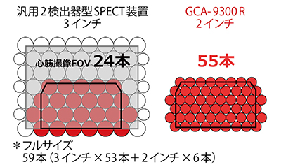 汎用2検出器型SPECT装置では,主に3インチ光電子増倍管(以下,PMT)が採用されているのに対して,GCA-9300Rでは2インチPMTを採用した。有効視野の面積あたり2倍以上の密度でPMTが配置されているため,より精密な位置検出が可能となり,均一性向上に寄与する(図3)。