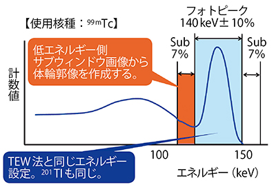 そこで,この問題を解決するためSegmentation with Scatter and Photopeak window data for Attenuation Correction(以下,SSPAC)法が前田らによって開発された2)。SSPAC法は被検者に投与されたSPECT用トレーサから放出されるガンマ線の情報のみを用いて減弱マップを作成する方法である。通常使用されるフォトピーク領域のデータに加え,コンプトン散乱領域のデータも使用する。データ収集のエネルギーウィンドウ設定は,フォトピークウィンドウとサブウィンドウからなる散乱線補正法(TEW法)と同じである(図6)。