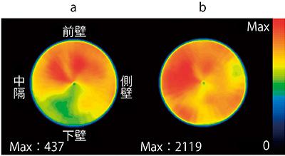 図8に,201Tlによる正常例でのSSPAC法の効果を示す。図8 aに示すとおり,201Tlのようなエネルギーの低い核種では,下壁中隔領域において減弱の影響を大きく受け,SPECT画素値低下のアーチファクトが生じている。しかし,図8 bのSSPAC法の結果画像では,減弱によるアーチファクトが低減し,均一な分布となっている。