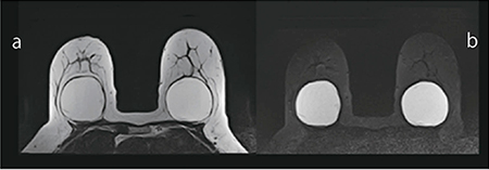 シリコンインプラント検査用の撮像シーケンスPASTA-Siは,シリコン成分を高信号に描出することができます。そのため,インプラントの内容成分がシリコンか生理食塩水かの識別,さらにはシリコンの漏れの有無を正確に確認可能です(図1)。従来,シリコン成分を高信号で描出したい場合は,手動で中心周波数をシリコンの周波数に合わせる必要がありました。しかし,脂肪の周波数も近傍にあり,設定を誤ると脂肪抑制不良やシリコン成分が高信号に描出されないといった問題が生じていました。PASTA-Siが有用な点は,シリコンの周波数を自動で認識することです。これにより,手動による中心周波数の再設定が不要で,確実にシリコンインプラントを高信号化することを可能とします。