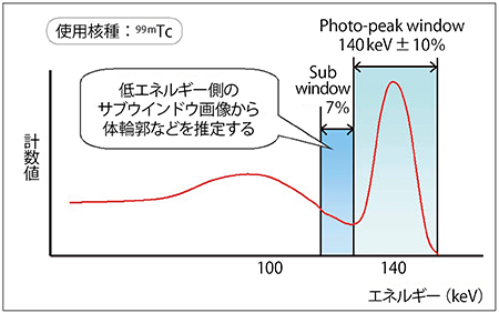 SSPAC法は,被検者に投与されたSPECT用トレーサーから放出されるγ線の情報を用いて減弱マップを作成する手法で,フォトピークウインドウデータとコンプトン散乱領域のデータ(サブウインドウデータ)を利用して,SPECT画像から減弱マップを作成するため,追加のSPECT収集・CT撮影が不要である。データ収集のエネルギーウインドウ設定は,フォトピークウインドウとサブウインドウからなる散乱線補正法(TEW法)と同じである(図4)。