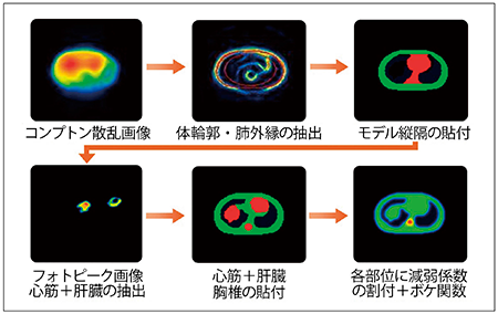 最初に,サブウインドウデータから得た再構成画像から体輪郭および肺外縁の抽出を行い,ここにあらかじめ用意しているモデル縦隔を合成する。次に,フォトピークウインドウデータから得た再構成画像より心臓および肝臓を抽出し,あらかじめ用意したモデル胸椎とともに合成する。最後に,得られた各部位に決められた減弱係数の割り付けを行い,SPECT位置分解能と同等の分解能となるよう,スムージングフィルタ処理を行うことで,各スライス面での減弱マップを得る。