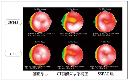 図6に,SPECT/CT装置で心筋SPECTの減弱補正を行った場合と,SSPAC法を用いた場合を比較した結果を示す。補正なしでは存在しない心尖部の画素値低下が,SPECT/CT装置を用いた補正で認められるのに対し,SSPAC法ではより均一な画像となっていることがわかる。これは,前者ではSPECT画像と減弱マップの間に位置ズレが存在するのに対して,後者ではこれが存在しないためと考えられた。