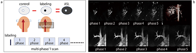 図1 mASTAR法のデータ取得方法(a)と腎動脈と門脈の画像例(b)