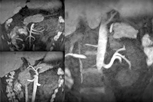 非造影MRA撮像は,さまざまな手法の開発とともに適応領域を大幅に広げてきた。腹部領域においては,特にASL法を応用したTime-SLIP法により血管を選択して描出することが可能となり,さらに血液の流れを利用した撮像法のため,血流の方向性なども観察できるようになった。しかし,血流動態を把握したい場合,Time-SLIP法は1回の撮像で1つの血流時相しか描出できないため,撮像を複数回繰り返す必要があり検査として非常に困難であった。そこで誕生したのが,ASLとlook-lockerサンプリングを組み合わせた“mASTAR法”である。mASTAR法では一度のラベリングで複数時相のデータを収集できるため(図1 a),1回の撮像で撮像時間を延長することなく血流動態の観察を可能とする(図1 b)。また,近年では,ultrashort TE(以下,UTE)法とASL法やmASTAR法を組み合わせた撮像も用いることが可能となっている。UTE法は,位相エンコード傾斜磁場を用いずにRF 励起パルスのすぐ後からデータ収集を行うため,非常に短いTEでの撮像が可能なシーケンスである。そのため,血流の速い部分や金属の影響による信号低下を抑えることができる。頭部領域ではすでに臨床活用されており,ステントやクリップ留置部の描出向上が報告されている。腹部領域においても,術後のフォローアップなどで同様の適応が期待され,検査適応の幅がさらに広がるものと考えられる(図2)。