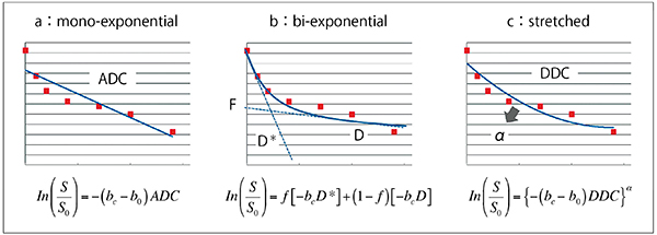 IVIM解析は,拡散強調画像を用いて灌流の情報を観察可能にする解析である。体内の水分子の動きは,大きな血管内の動き(以下,coherent motion),すなわち一定の方向への動きと,ランダムな動き(以下,incoherent motion)がある。さらに,incoherent motionは毛細血管内の流れ(以下,perfusion)と細胞内や細胞外間質での拡散(以下,diffusion)に分けられる。通常使用する拡散強調画像では,perfusionの影響を無視するために高いb値での拡散強調画像を用いて,見かけの拡散係数(以下,ADC)をmono-exponential model(図3 a)で算出する。しかしながら,incoherent motionを分離して考えた場合,b値が低い部分(200s/mm2以下)ではperfusion,b値が高い部分(200〜1000s/mm2以上)ではdiffusionによって信号低下が生じると考えられる。そこで,これらを考慮するモデルとして,減衰曲線をbi-exponential model(図3 b)やstretched model(図3 c)で近似する手法が用いられる。前者は,真の拡散係数D,灌流を拡散と見なした疑似拡散係数D*,ボクセルから得られる信号のうち灌流として働く水分子の割合fが定義され,後者は,水分子拡散状態の不均一性を表すα,およびdistributed diffusion coefficient(DDC)が定義される。