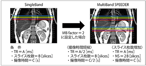 IVIM解析には,複数のb値で撮像した拡散強調画像が必要である。臨床活用においては,撮像時間や値の再現性,安定した画像の取得などの課題がある。しかし今日,複数のスライスを同時に取得可能な“MultiBand SPEEDER”の登場により,短時間により多くの断面の撮像が可能となっている(図4)。