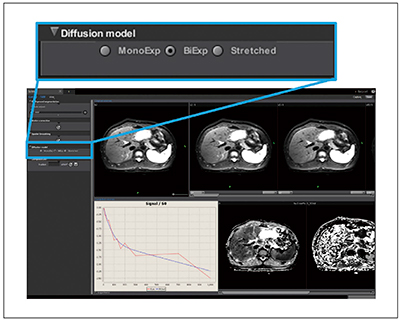 また,データ解析手法も非常に重要である。通常使用される最小2乗法によるフィッティングでは,呼吸の影響やSNRの問題などにより信号値がバラつき,正確なフィッティングカーブを得ることが難しく,安定した結果が得られないことがある。当社のマルチモダリティワークステーションである「Vitrea」には,世界で初めてFDA Clearanceを受けたOlea Medical社製のIVIM解析アプリケーションが搭載されており,ベイズ確率に基づき,観察事象から推定事象を確率的に推論するベイズ推定法を用いることで,安定したロバスト性の高い結果が得られる(図5)。解析手法としてmono-exponential modelやbi-exponential modelだけでなく,stretched modelも用いることができ(図6),各モデルに基づくcomputed DWIの作成も可能である。