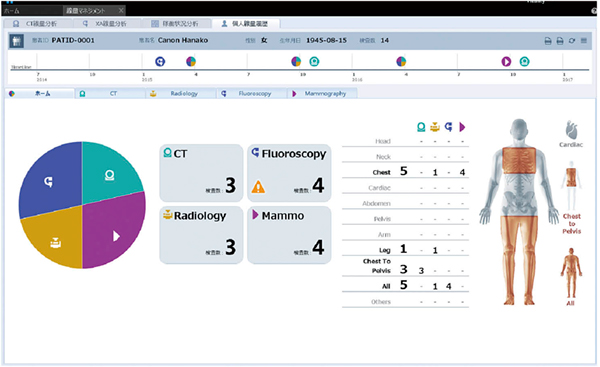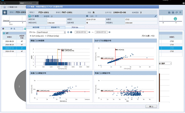 CTやX線循環器診断システムなどから得られる線量情報を,DICOM RDSRやDICOM SC(OCR処理)から取り込み,指定の条件に従って分析,グラフ表示などの視覚的な結果参照を基本機能とする(図1)。また,DRLs 2015などの線量ガイドラインを参照し,閾値を超える線量値(CTDIvol,DLP,DAP,入射皮膚線量など)や検査時間の確認,患者個人・装置・操作者ごとの検査履歴・線量サマリーを確認できる(図2)。さらに,特定の撮影プロトコールに着目した線量トレンド分析の結果や照射録の参照が可能となっている。また,分析結果を,PDF形式のレポートや二次利用を可能にするCSV形式へデータへの出力機能を持っている。