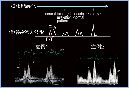図1 僧帽弁流入波形のバターン分類と実際の症例の波形(症例1,2)