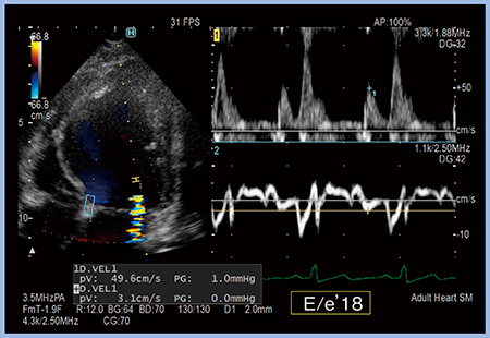 症例2について,同一心拍で2か所のドプラ波形を同時に計測可能な“Dual Gate Doppler”で計測すると,E/e’は18と高値であった(図3)。