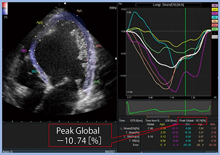 “2D Tissue Tracking”は,スペックルトラッキングをきわめて簡便に解析し,Global Longitudinal Strain(GLS)を算出できる。症例2を解析すると,収縮および拡張の間隔にバラツキが見られ,GLSも−10.74%と低値であり(図4),左室機能が低下していることがわかる。