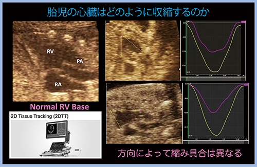 また,胎児の正常な左室の弁輪部の動きを2D Tissue Trackingで見ると,中隔方向の収縮時に小児には見られない特徴的な動きがあった。胎児の心臓収縮様式はもとより,既知の先天性心疾患についても,新しい知見が得られる可能性がある。