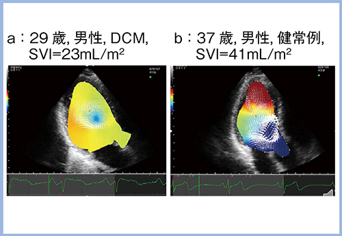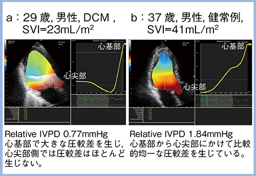 断層面内の相対的な圧較差分布を可視化する“Relative Pressure Imaging(RPI)”画像は,圧が高いほど赤く表示される。健常例(図1 b)では,心基部から心尖部へと高い圧が移動しており,僧帽弁の前尖上に渦流が観察される。一方,DCM例(図1 a)では,拡張早期に心基部側に高い圧が見られるが,その後,薄い色が全体に広がり,高い圧が心尖部にまで移動しない。渦流も僧帽弁の前尖上にとどまらず,心尖部の方に大きく広がっている。