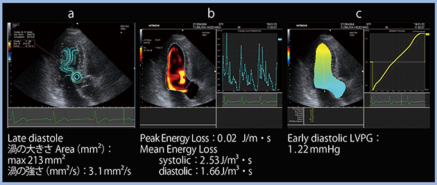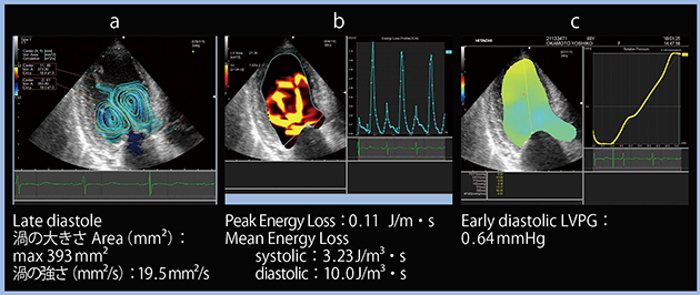 図1 健常例におけるVFMのパラメータ a:流線表示(渦の評価) b:エネルギー損失 c:LVPG
