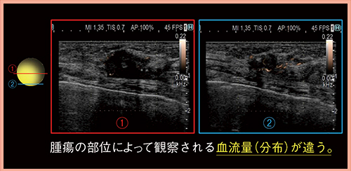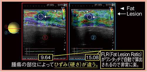 DFIでは,腫瘍中心よりも辺縁から多くの血流を受けており,部位によって観察される血流量(分布)が異なることがわかる(図1)。また,Bモードだけでも悪性と判断できるが,RTEも悪性を支持する所見であった(図2)。RTEでは,脂肪と病変のひずみの比であるFat Lesion Ratio(FLR)(図2□)がワンタッチで自動計測でき,非常に簡便である。FLRは数値が大きいほど腫瘍が硬いことを示すが,この腫瘍は中心が9.64,辺縁が15.08と部位によって硬さが異なっていた。針生検の結果も,部位によって細胞成分や線維(間質)の分布が不均一であることから,DFIやRTEの差は組織構築成分の違いを見ているものと考えられる。DFIとRTEを組み合わせることで,より的確な生検部位の同定が可能になると思われる。