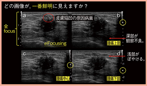 本症例は,主病巣近傍に線維腺腫(FA)を認める。図3は,主病巣でのフォーカスの違いによる画像の見え方の比較であるが,eFocusing(a)は全領域にフォーカスが合っているため,1点フォーカスの画像(b〜d)と比べて,浅部から深部まで鮮明である。本症例は皮膚にやや陥凹を認めたが,eFocusingではその原因病巣も描出されている(図3 a○)。また,DFIを見ると,FAの方が乳がん病巣よりも血流が豊富であった。閉経前の場合は良性腫瘍でも血流が豊富であることを認識しておく必要がある。生検材料では,乳がん病巣は細胞成分が少なく,間質成分が豊富であり,あまり血流を必要としない可能性がある。