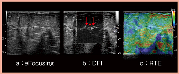 この病変は,マンモグラフィにて区域性石灰化と背景乳腺の濃度上昇域が認められる。DCIS成分は厚みがあるが,eFocusing(図4 a)で浅部から深部まで鮮明に描出されるため,病巣範囲の推測・同定が可能である。さらに,DFI(図4 b)にてDCIS周囲の低流速の血流を的確に描出しており,この穏やかな血流が病変を養っていると推測できる。RTE(図4 c)でも青く描出されており,FLRも5.77であった。
