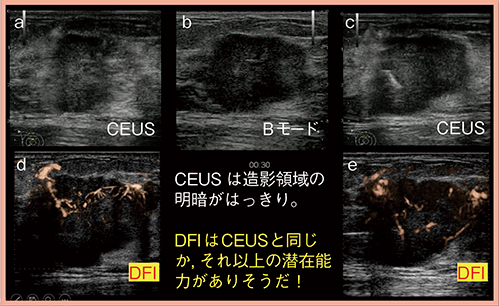 本症例は,Bモード(図5 b)では病変が均一に見えるが,ソナゾイド造影超音波(CEUS:図5a,c)では造影領域の明暗がはっきりと描出されており,血流が不均一であることがわかる。DFI(図5d,e)では,細い血管が繊細に描出されており,CEUSの血管構築と近似していた。DFIは,非造影でもCEUSと同等以上の描出能を有していることが期待される。針生検などの際には,DFIやRTEを忠実に行うことで,病変の採取率も向上すると思われる。