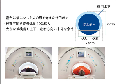 快適な検査空間を追究した楕円ボアは,図1に示すように,左右方向を74cm,上下方向を65cmと大幅に拡大しました。Spineコイルを組み込んだ薄型設計テーブルにより,テーブル上の実質的なスペースを拡大して,検査空間を従来の60cmクラスのボア装置からおおよそ40%も拡大しました。このため,体の大きな被検者でも,上下,左右方向ともに十分な余裕があります。