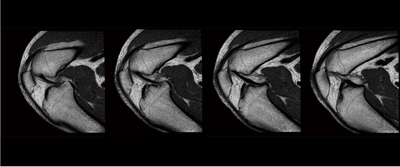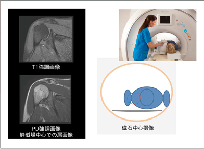 楕円形状のボアは,これまで困難であった撮像の可能性を広げます。楕円ボアの効果として,図2に示すように,肩関節などのオフセンター部位を撮像する際に,撮像部位を静磁場中心に移動できるため良好な脂肪抑制効果が得られ,高画質画像を得ることができます。また,自由な体位での撮像が可能で,まっすぐに寝ることが困難な被検者では,横になって撮像することも容易です。関節部の撮像では,図3に示すような膝関節の屈曲位など,大幅に拡大した左右方向のワイドボアを生かした撮像が可能です。