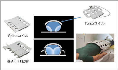 63cm幅のワイドテーブルは,脊椎撮像用のSpineコイルも拡張しました。Spineコイルの左右の部分をフレキシブルな構造として巻き付けて使用することで,腹部撮像時にコイルの感度範囲を有効に利用して,感度をさらに向上することができます(図4)。また,脊椎撮像時にはフラットな形状で使用することで,不必要な背中部分の脂肪信号を抑えることも可能です。