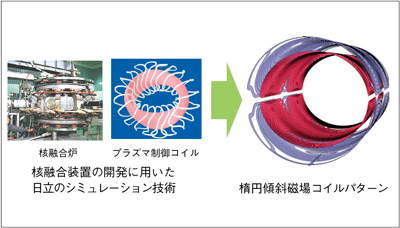 日立には,超電導オープンMRI「OASIS」で開発したフラットな傾斜磁場コイルを設計できる高度な技術があります。図5に示すこの技術は,核融合装置のプラズマを制御する高精度コイルを設計するために日立が開発した解析シミュレーションプログラムです。これは,従来のようにコイルパターンを入力して発生する磁場分布を計算するのではなく,発生させたい磁場分布とコイルの存在位置を入力して,逆問題を解いて任意の形状のコイルパターンを計算できる優れたプログラムです。この技術により,「ECHELON OVAL」ではこれまで困難であった楕円形状の傾斜磁場コイルパターンを完成させました。さらに,このシミュレーションプログラムは,静磁場の均一性を向上する磁場シミングのシミュレーションにも応用されています。