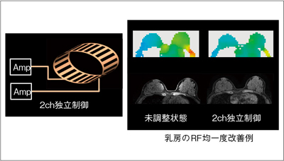 楕円ボアの実現には,ボアの最も内側に配置されるRF照射コイルも楕円形状にする必要があります。「ECHELON OVAL」は,新開発された楕円形状のRF照射コイルを搭載し,さらに,3T装置と同様な照射位相とパワーを独立してコントロールできる2ch独立制御方式を採用しました。これにより,図6に示すような照射不均一の発生しやすい乳房撮像においても,安定した均一RF照射を可能とし,高画質を実現しました。