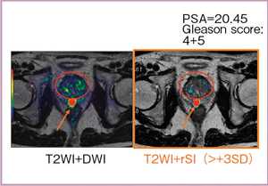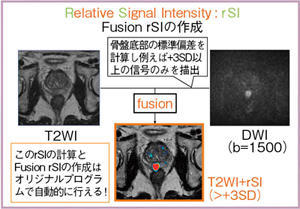 rSI画像は,DWIの骨盤内の信号強度を測定してSDを計算し,特定の信号(例えば,3SD以上)のみを描出する。そして,このrSI画像とT2WIのフュージョン画像を作成するが,このときT2WIとDWIが同じ断面・大きさであるため,直接フュージョンできる。このフュージョン画像は,オリジナルプログラムにより自動的に10秒以内で作成できる(図1)。