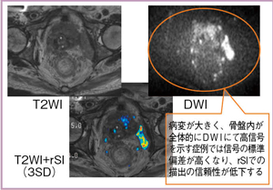 rSI画像は,比較的限局した病変の描出に有効であるが,撮像範囲内であれば周囲への浸潤(図5),リンパ節転移や骨転移も描出することができる。一方で,病変が大きく,骨盤内が全体的にDWIにて高信号を示す症例では,信号の標準偏差が高くなり,rSIの信頼性が低下する(図6)。また,小さい病変やGleason scoreが低い病変では,rSI画像での評価は難しい。特に大きさの要素が強く,病変の長径が4mm以下の場合は検出が難しい。しかし,前立腺癌はslow growthの腫瘍のため,MRIやPSAでの経過観察をすれば問題はないと言える。