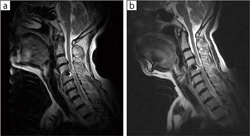 70歳代,女性。APERTO Lucent Plus(b)では,Lサイズ関節コイルを用いることで体動の影響が軽減され,脊髄の細部も良好に描出できた。