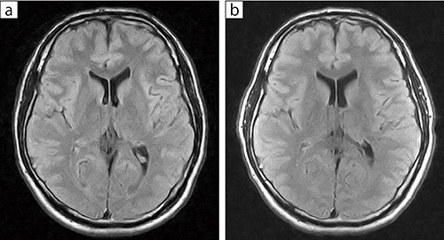 40歳代,男性。関節コイル(b)を用いても,頭部コイル(a)と比べ遜色ない画質が再現できた。