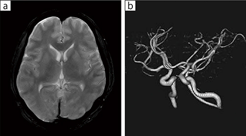 b:MRA volume rendering,TR/TE:41.4/6.5,スライス厚:1.2mm,FOV:200mm,FA:90°,マトリックス220×116,撮像時間:9:36