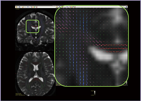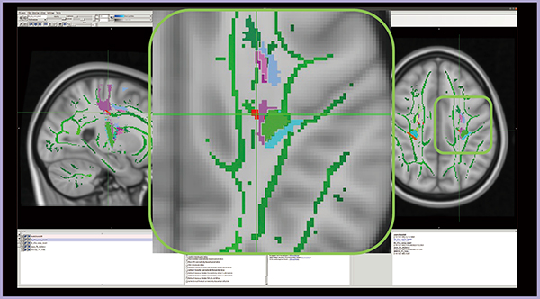 DTIを解析するために患者の画像を空間的に標準脳に変形すると,末梢になるほど患者ごとの位置ズレが大きくなり,そのまま統計解析を行うことは難しい。そこで用いられるのが,統計解析手法のTBSS(Tract-Based Spatial Statistics)2)である。TBSSは,対象症例のFAマップから平均FAスケルトン(白質骨格)を作成し,これを用いて各症例のFAマップを空間的正規化することで,同じ位置での統計解析が可能となる。また,検定をスケルトンだけに限定することで多重比較の補正が容易になるメリットもある。