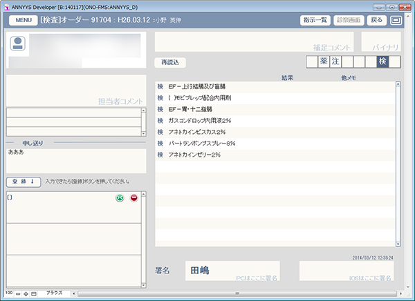 おの英伸クリニックのANNYYS_D版基本画面 右画面が自作カルテからカスタマイズした“検査ポータル”
