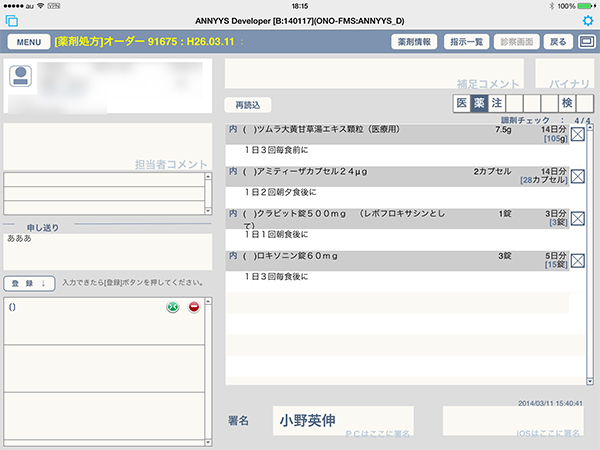 調剤室でのiPadの確認画面
