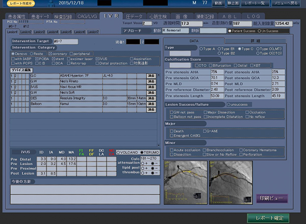 CardioAgentでは,カテラボのさまざまなニーズに対応した,FileMakerベースの柔軟なシステム構築とカスタマイズ対応が特長だ。今回,ロータブレーターなどの新たな手技が追加されたが,新しいデバイスや手技の導入など,日々進化する診療内容に対応できるように,項目やタブの追加など仕様変更にはカスタマイズを行っている。例えば,東芝メディカルシステムズが開発した入射皮膚線量モニタリング機能“Dose Tracking System(DTS)”がいち早く導入されたが,そのデータもCardioAgentに取り込まれている。佐野技師長は循環器のレポートシステムについて,「CardioAgent導入前にはFileMakerで自作もしていましたが,1人の患者さんで複数の病変があった場合の記述など複雑で難しいところがありました。CardioAgentのレポートシステムでは,詳細で複雑なデータの入力が1画面で可能になり,レポートから動画像へのリンクやキー画像のレポートへの貼付など,データの活用が可能になりました」と述べる。