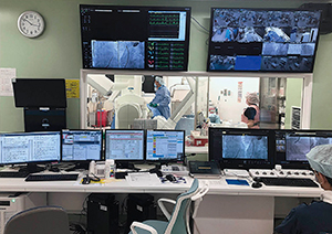 一方で,柴田センター長は,「ネットワークではリアルタイムの情報伝達,共有が可能で,院内で行われる手技や診療業務のサポートも大きな役割です」と述べ,術中映像を院内にリアルタイムで配信・記録する“術中映像配信・共有システム”や,電子カルテと連携してカテ室の効率的な運用を行う“患者呼出システム”を構築して,安全で質の高い診療を提供している。