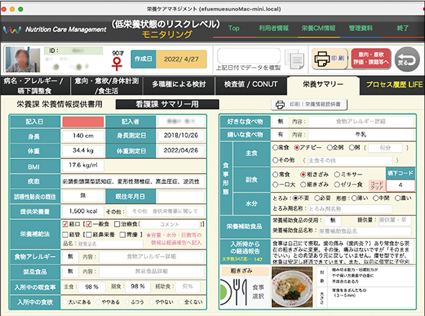 FileMakerで作成されたカスタムAppは,事務(勤怠管理,掲示板など),支援相談員(面会・スケジュール,相談記録,業務日誌など),ケースワーカー(入退所管理,ベッドコントロールなど),リハビリ(スケジュール管理,実施記録など),栄養管理(体重履歴,栄養補給,必要栄養量計算,検査値やCONUTの計算・参照,栄養サマリーなど)など多岐にわたる。そのほか“デジタルサイネージ”は,施設入口にタッチパネル式のモニタを設置し,施設が提供する介護サービスの内容,イベント情報などを表示する。新保氏は,「FileMakerとMac miniでコストをかけずに安価に設置できました」と言う。新保氏は,「今では法人業務の9割以上がFileMakerで作成したシステムで処理,管理されています。本来の職責をまっとうしながら,システム開発という任務をこなすことができたのも,FileMakerのローコード開発のおかげだと思います」と語る。