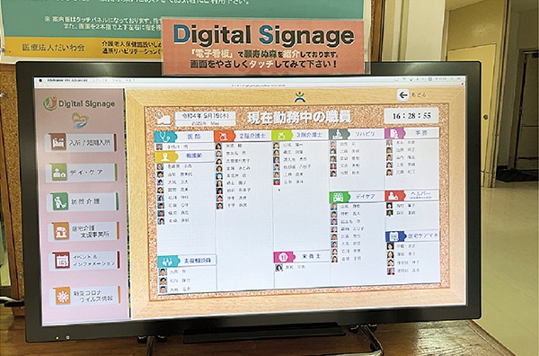 施設入口に設置されたFileMakerを使って作成したデジタルサイネージ