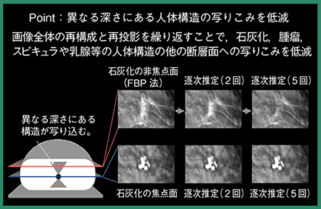 異なる深さの人体構造の写り込みアーチファクト低減では,画像全体の再構成と再投影を繰り返すことで,石灰化や腫瘤の他の断面層への写り込みを低減する。従来法(FBP)では,粗大な石灰化がDBTの焦点面以外で撮影方向に対する尾引きアーチファクトとして現れていたが,これが低減されれば画像改善が期待される(図1)。